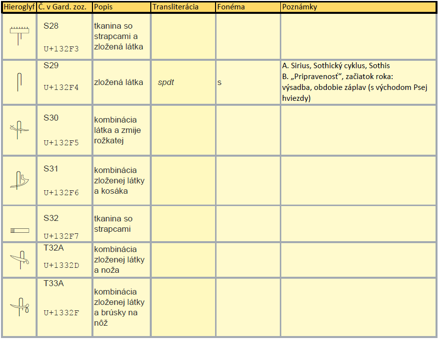 Medzi fonetickými hieroglyfmi nájdeme zložené plátno S29. Toto zložené plátno súvisí s hviezdou, s vodou, s blahodarnými povodňami, teda s požehnaním a so začiatkom nového roka, teda s časom. Asi ťažko by ste v ňom našli tvarovú podobu s mem מ. Ale ak sa pozriete na hieroglyf T32A, ktorý znázorňuje kombináciu zloženej látky a noža, celkom prirodzene nás môže napadnúť trhanie, či delenie šiat, ktoré vidíme v hornom záreze, či natrhnutí mem מ. Okrem prehodenej látky nájdeme tiež tkaninu so strapcami, ktorá je vlastne len malým detailom dotvorený hieroglyf bazéna.