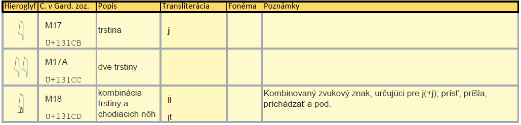 Ak by sme hľadali medzi fonetickými hieroglyfmi nejakú rastlinu, nájdeme iba jednu jedinú, trstinu M17. Ale hlbšie štúdium nás privedie k nádhernému hieroglyfu trstiny s nohami M18, ktorý znamená sloveso prísť, prichádzať. Kráľovná Nefertity ho má vo svojej kartuši a jej meno znamená Krásna prišla.