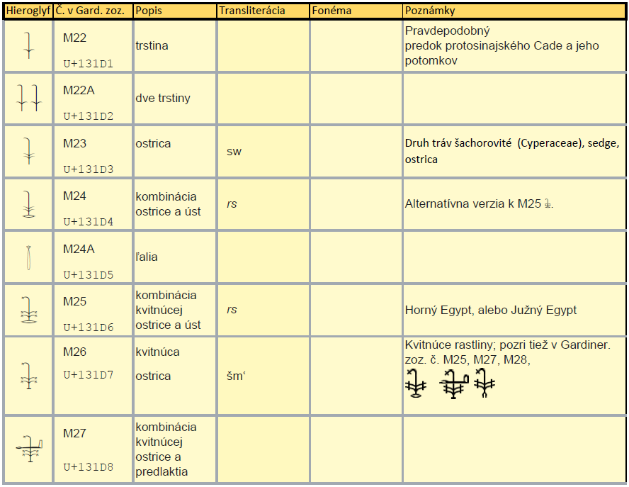 V Gardinerovom zozname nájdeme ďalšie zaujímavé hieroglyfy rastlín, kombinácie rastliny s bochníkom chleba M5, s ústami M6 a so stolcom alebo rohožkou M7. Čo by mohlo odkazovať na akési triedenie rastlín na obilniny, jedlé rastliny a úžitkové rastliny. (Stranovú obrátenosť si vôbec nemusíte všímať, lebo hieroglyfy majú aj svoju pravú, aj ľavú orientáciu, využívanú v závislosti od smeru písania, aj keď štandardný smer písania je sprava doľava.)