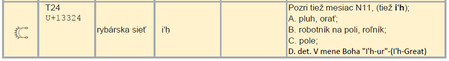 Hneď pri prvom celkom zbežnom pohľade ma zaujal posledný hieroglyf, hieroglyf kobry I10, tak nápadne tvarovo podobný písmenu lamed ל. Ak je lamed ל kobra, had, drak, a gimel ג je vystupujúci z vody, resp. noha (čo je v súlade s kabalistickou symbolikou), ktorá je v tom obraze vystupujúceho dominantná, a ktorá sa tiež nachádza medzi fonetickými hieroglyfmi ako D58, potom som objavil niečo, čo bolo doteraz skryté.